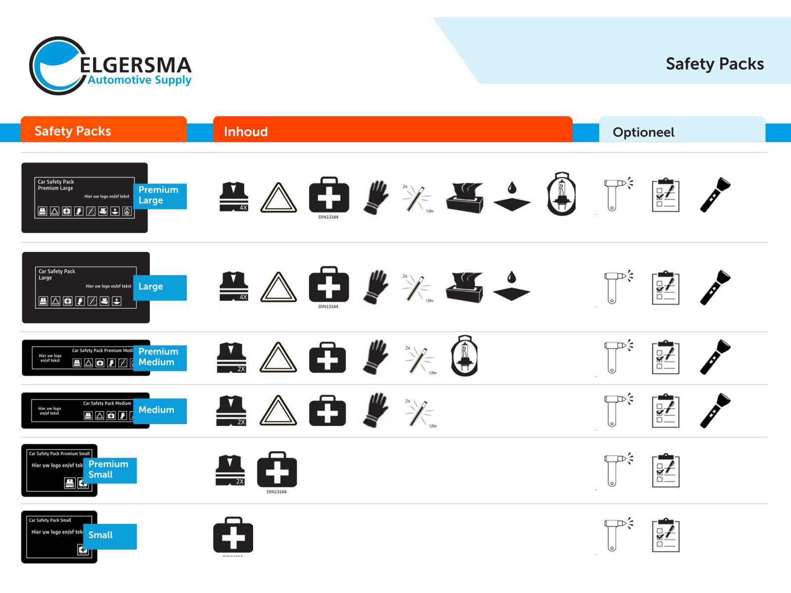 Ons aanbod in Safetykits is zeer compleet. We kunnen je tas volledig naar wens ontwerpen en voorzien van de gewenste inhoud. Je eigen customized Safetykit! Of je nu voor een basic pakket gaat of juist een mooi uitgebreid pakket, alles is mogelijk.